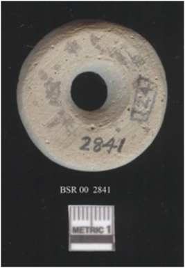 | Description / विवरण | Terracotta spindle whorl, perforated, fine fabric, traces of chocolate slip and having sting marks. |