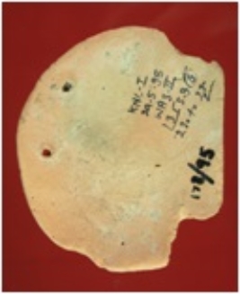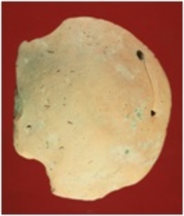 | Description / विवरण | Trench WA 3, Qdt 2, pit 3 SB, layer 6, depth 270 cm It is a broken scale made of baked clay. Two holes are passing through near the edge. Surface is rough and brick brown in appearance. |