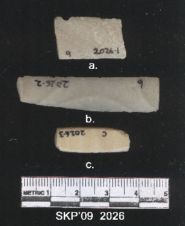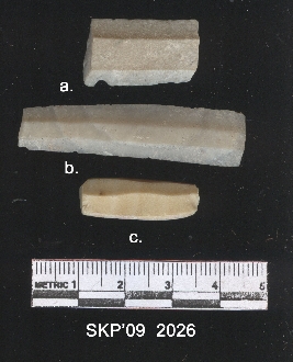 | Description / विवरण | This is a chert blade with flat ventral side, flaked ridges on the dorsal side and rounded sides, side margins are not retouched. |