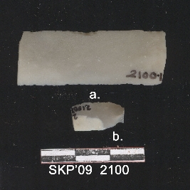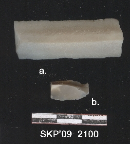 | Description / विवरण | Chert blade, one end triangular cross section, bulb of percussion at the other end, flaked ribs. |