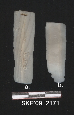 | Description / विवरण | This is a chert blade with broken ends, one side end, broken, with trapezium cross section, other end triangular cross section. Natural satiation marks on both sides. And denticulated margins. Broader end also shows a chisel mark at the dorsal side end. |