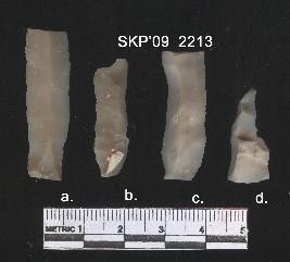 | Description / विवरण | Uneven long chert blade with one end retouched to a sharp pointed end head flaked marks visible is the dorsal side all over. |