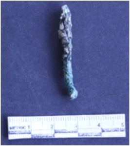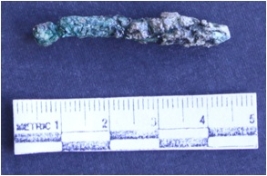 | Description / विवरण | It is copper rod fragment, badly corroded and greenish brown in color. Elongated in shape. Circular in section. |