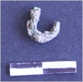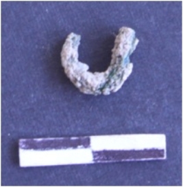 | Description / विवरण | It is a broken fish hook fragment curved from the center, badly corroded and greenish in color. |