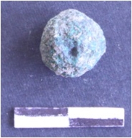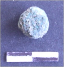 | Description / विवरण | It is a corroded copper pellet, round in shape. Greenish in color. Some small soil particles embaded on it. |