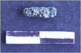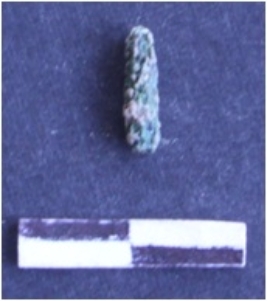 | Description / विवरण | It is a corroded copper rod fragment, greenish brown in color. Oblong in shape, rolled from the edges. |