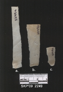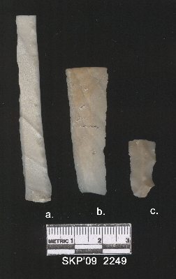 | Description / विवरण | Chert blade brown ends, trapezium cross section at both end. Natural impure substance on the surface. There is a bend at the opposite end. Flaked ridges and use ware marks visible. |