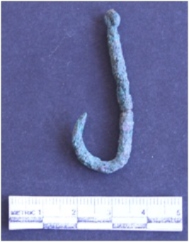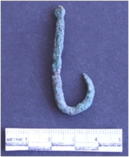 | Description / विवरण | It is a complete copper fish hook, corroded. Greenish brown in color. It is in U shape in one end of the fragment. Perforated on one end of the hook for typing up. |