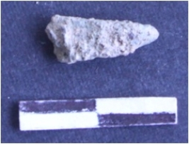 | Description / विवरण | It is a pointed corroded copper tool, it is in a shape of an arrow point. Some soil particles emboded on the fragment. |