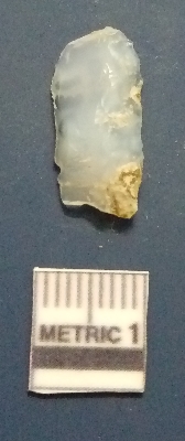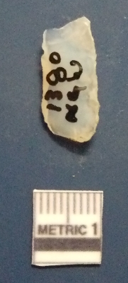 | Description / विवरण | It is a blade fragment. The ridges are clearly seen on the dorsal surface. The sides are sharp and retouched. The ventral surface is plain. Triangular in cross section. It is white in color. |