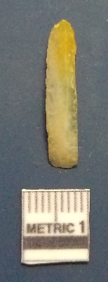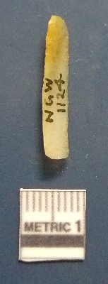 | Description / विवरण | It is a blade fragment. The ridges are clearly seen on the dorsal surface. The sides are sharp and retouched. The ventral surface is plain. Yellowish in color. |