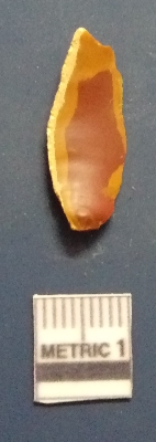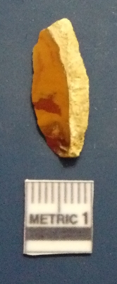 | Description / विवरण | The chert object. The ridges are clearly seen in the surface. The ventral surface is plain. The bulb of percussion is seen on the ventral surface. The sides are sharp and retouched. |