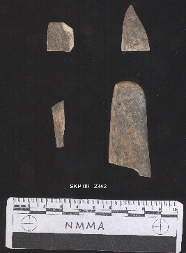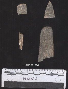 | Description / विवरण | It s a bone scraper. Fragmented brownish color. Flat and smoothed. The cutting edge is broken. It is broken in to four pieces. |