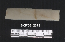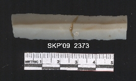 | Description / विवरण | Long chert blade. It is rectangular in structure. It is broken and triangular in cross section. The ridges can be clearly seen. The sides are retouched. The ventral is plain. |
