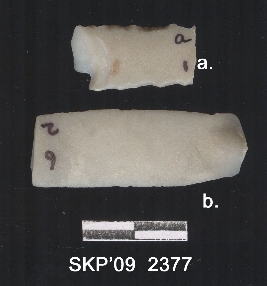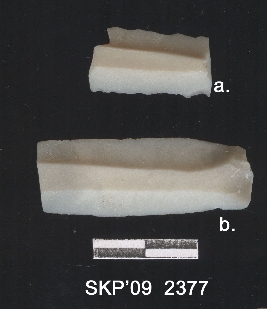 | Description / विवरण | Broken chert blade, it is rectangular in structure, the ridges can be seen clearly, the sides are retouched. The ventral surface is plain. It is trapezium in cross section. |