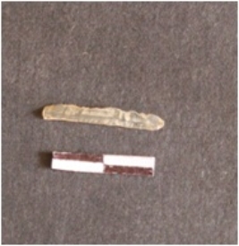 | Description / विवरण | Chalcedony blade fragment has a ridge on dorsal side, striking platform, bulb on ventral side broken from distal end, triangular cross-section and use-wear marks on edges. |