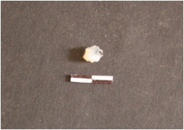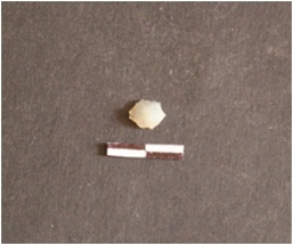 | Description / विवरण | Chalcedony flake has flake scars on dorsal side, striking platform, bulb on ventral side, retouches and use-wear marks on edges. |