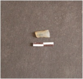 | Description / विवरण | Chalcedony blade fragment has two ridges on dorsal side, broken from proximal end trapezoidal cross-section and use-wear marks on edges. |