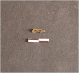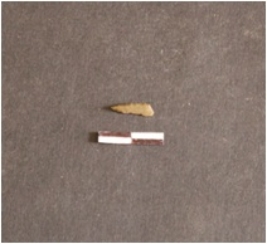 | Description / विवरण | Chert point fragment has a ridge on dorsal side, broken from proximal end, pointed along at distal end, backing at one edge and use-wear marks on other edge. |