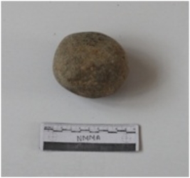 | Description / विवरण | Hammer stone made on granite. Roughly circular in shape. Abraided along the circumference. Polished surface. |