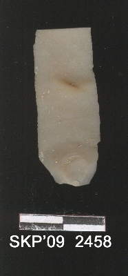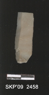 | Description / विवरण | Broken chert blade. It is retouched in structure and in triangular in cross section. The sides are retouched. The ventral surface is plain. |