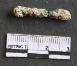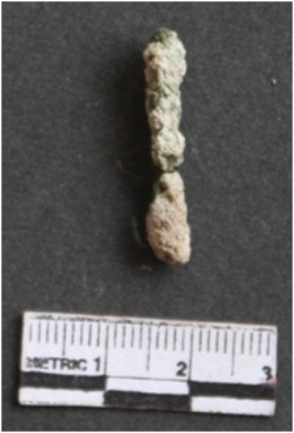 | Description / विवरण | It is a corroded copper rod fragment. It is greenish brown in color. Some soil particles are embedded on them. |