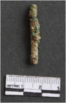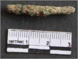 | Description / विवरण | It is a corroded copper rod fragment, greenish brown in color. Tapering from both the end. Given it a cylindrical from, circular in section. |