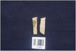 | Description / विवरण | a Fragment of Blade, Both the ends are broken, Triangular cross-section, Use wear marks along at working edges. b Fragment of Blade, Distal end broken, Trapezoidal cross-section, bulb of percussion on the ventral surface, Use wear marks along at the working edges. |