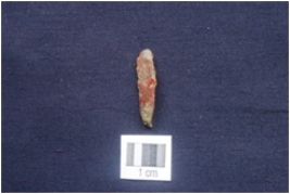| Description / विवरण | Backed Blade made on chert, Prepared platform, Difuse Bulb on ventral side, Backed along right lateral edge. |