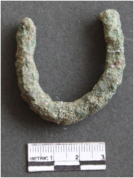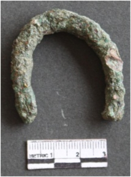 | Description / विवरण | It is a corroded copper hook fragment broken from one side. Appears in a house shape squarish in section. Greenish brown in color. |