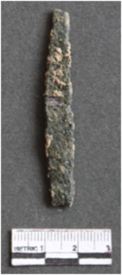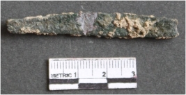 | Description / विवरण | It is a corroded copper blade fragment. It appears to be scissors blade Elongated in shape with two parallel and cutting edges. Parinated with soil impurities on the surface. |