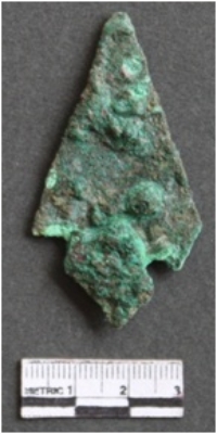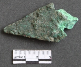 | Description / विवरण | It is a corroded copper arrow head or a super head. Copper tanged point. The point is complete and intact but the tang is broken. Pointed sharp edge on one end of the fragment. Greenish brown in color. |