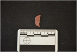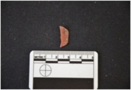 | Description / विवरण | A moss agate trapezoid has a mid ride on dorsal side, striking platform, retouches on one edge and use-wear marks on other cutting edge. |