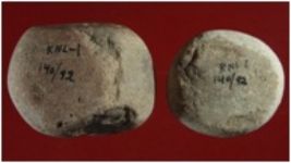 | Description / विवरण | Trench WC 3, Qdt 2, section 3, depth 40-70 cm These are two weights made of stone. Shape is circular but uneven and surface is rough with brownish appearance. |