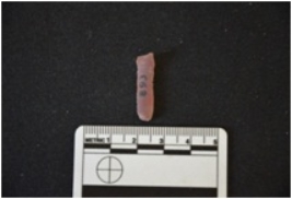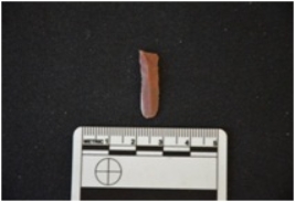 | Description / विवरण | Moss agate blade has a midridge on dorsal side, striking platform, bulb on ventral side, use-wear marks on cutting edges and triangular cross-section. |