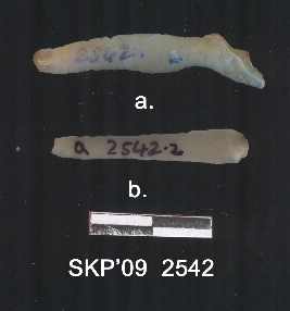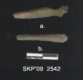 | Description / विवरण | Long chert blade, the ridges can be seen clearly, the sides are retouched. The ventral surface side is plain. Bulb of percussion can be seen. |
