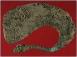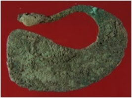 | Description / विवरण | Trench XH 1, Qdt 3, layer 1, depth 5-10 cms It s a razor made of copper. It is double edged and badly curved. Blade is flattened and much broad. It is sharp curved which is not seen usually in the razor. Tip is broad. |