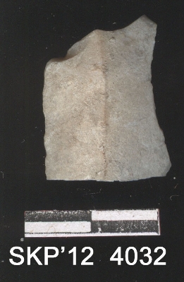 | Description / विवरण | This is a chert blade fragment with triangular cross section at one end. Other end irregularly broken or flaked. One lateral margin is sharp and the other margin is retouched and rounded. There is a bend on this margin; it is not in straight line. |