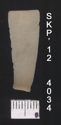 | Description / विवरण | This is a chert blade fragment with one end tapered, triangular cross section on both ends. There is a bent at the tapered side, use ware marks on the lateral sharp margins. |