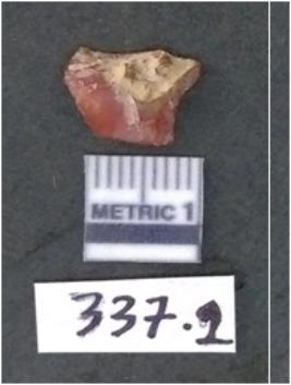 | Description / विवरण | It is a chalcedony flake with a bulb of percussion on the ventral side, cortex on one end. |