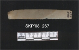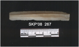 | Description / विवरण | Chert blade, it is long and rectangular in structure. The ridges can be clearly seen. One of the sides is retouched. The ventral surface is plain. |