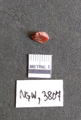 | Description / विवरण | It is a carnelian flake with a striking platfrom with bulb of percussion on the ventral side, edges on the surface with ripples on it. |