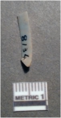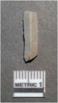 | Description / विवरण | It is a chert blade, both the sides are sharp and retouched. The ridges can be seen clearly on the dorsal surface. Ventral surface is plain and it is trapezoidal in cross section. It has pale white in color. |