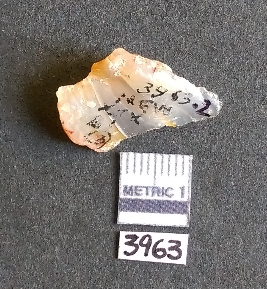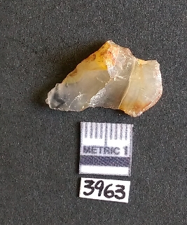 | Description / विवरण | It is a chalcedony flake with a bulb of percussion on the ventral side. |