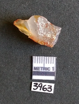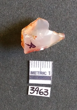 | Description / विवरण | It is a chalcedony flake with a bulb of percussion on the ventral side. |