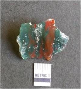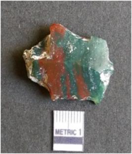 | Description / विवरण | It is a jasper flake with sharp edges and striking platform on the proximal end, flake scars on the surface with ripples on it. |