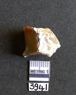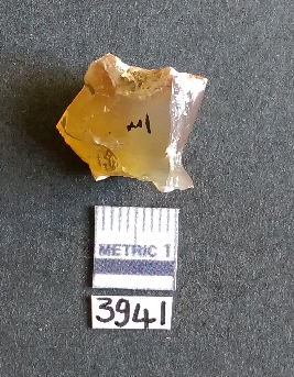 | Description / विवरण | It is a chalcedony flake with a bulb of percussion on the ventral side, cortex on one end. |