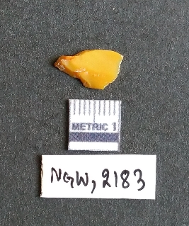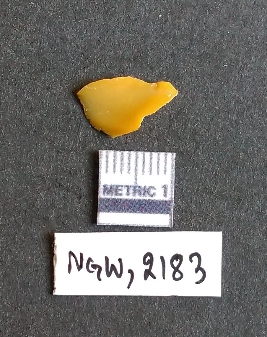| Description / विवरण | It is a chalcedony flake with a bulb of percussion on the ventral side, cortex on one end. |