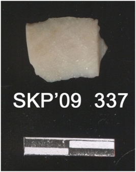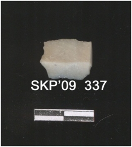 | Description / विवरण | Broken chert blade. It is triangular in cross section. The sides are retouched. The ventral surface is plain. |