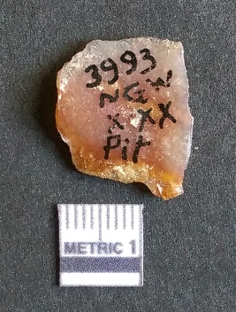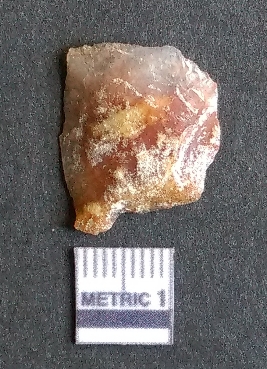 | Description / विवरण | It is a chalcedony flake with a bulb of percussion on the ventral side, cortex covered on one end. |
